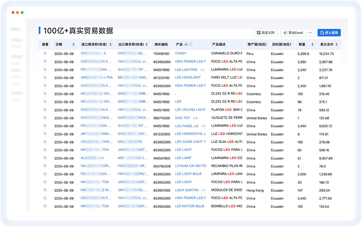 包含:进口商及出口商名称、海关编码、产品描述、原产国、目的国、总价、数量、单位等字段。