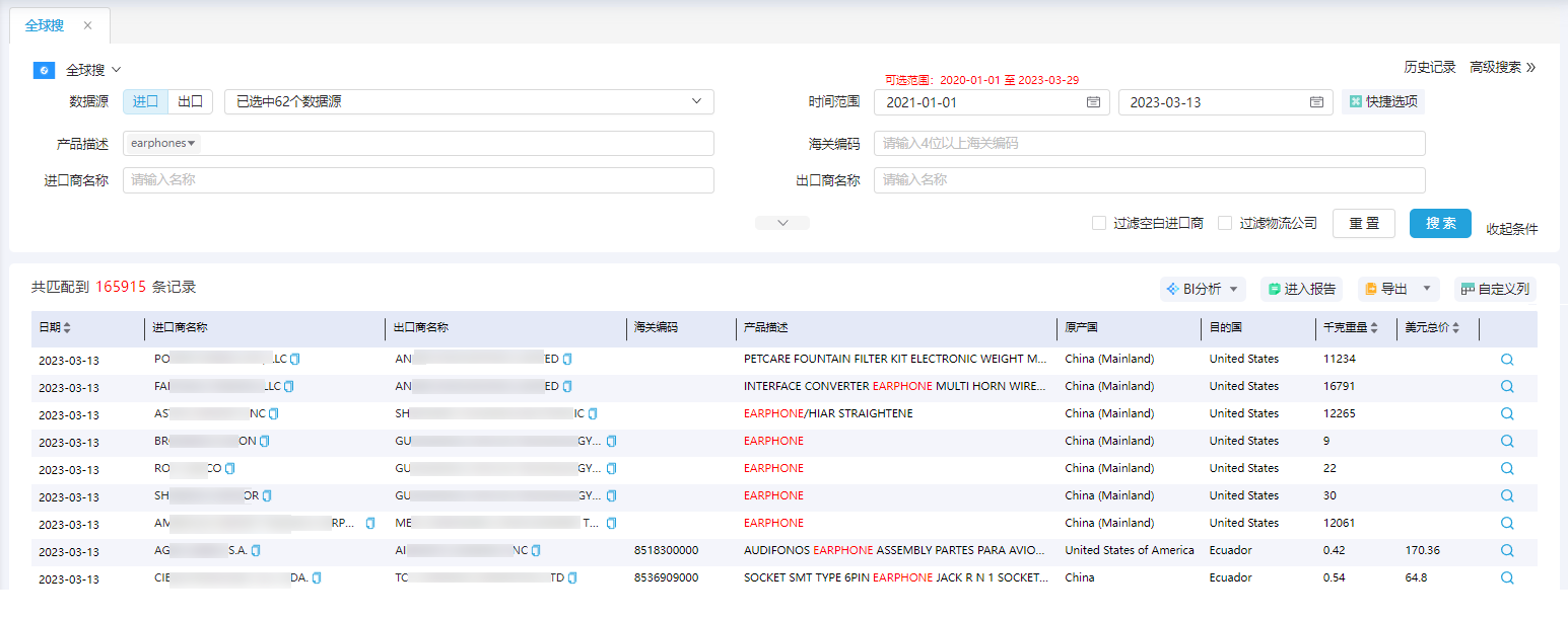3. 结合该核心产品的特点从ballbet贝博外贸通中,找出采购earphones的买家及其交易记录,顺利获得分析采购动态、交易趋势、供应链,竞品特点等等,有针对性的去挖优质潜客 。