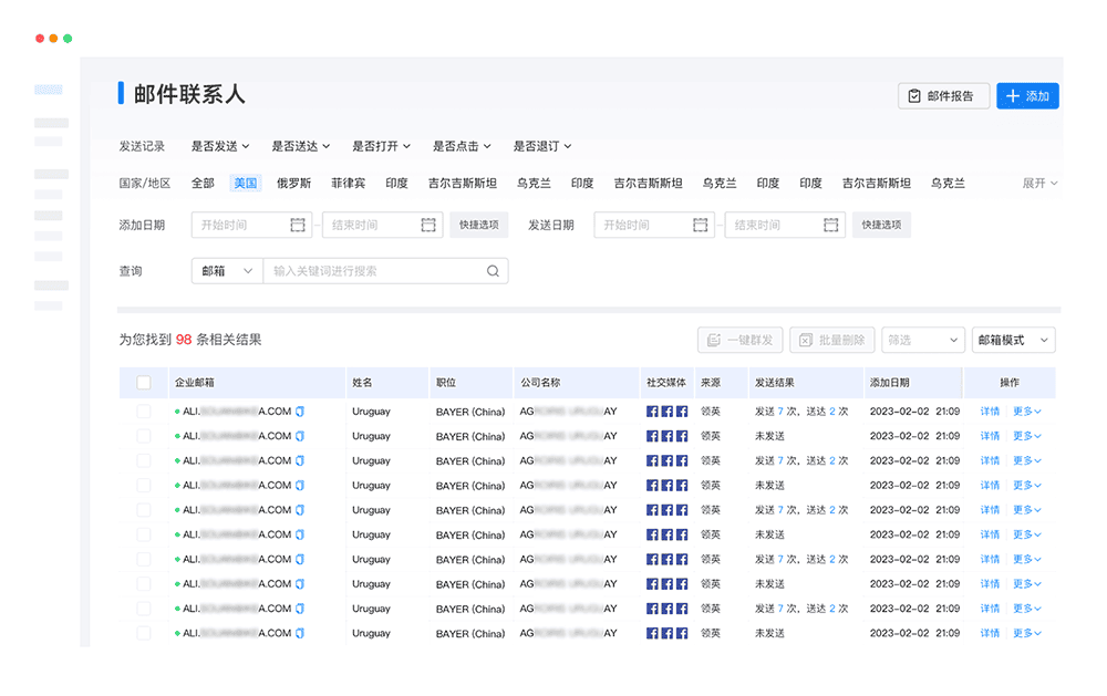 涵盖电话、邮箱、社媒等多渠道联系人信息,并顺利获得ballbet贝博云邮通及其他工具一键触达采购决策人,进行外贸找客户。