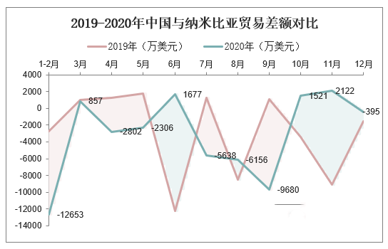 2019-2020年中国与纳米比亚贸易差额对比