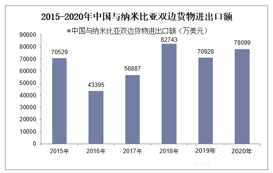 华经中国海关总署统计,2020年中国与纳米比亚双边货物进出口额为78098.5万美元,相比2019年增长了7170万美元,同比增长10.1%。
